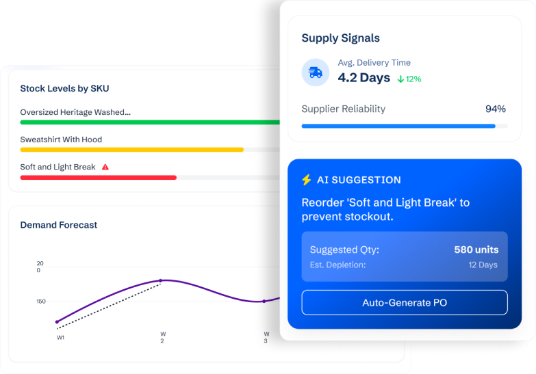 Tracks demand signals, lead times, and consumption patterns to keep inventory levels right. Less overstock, fewer stockouts, more working capital freed up with better demand alignment.