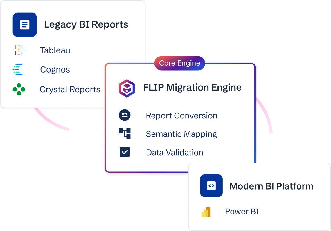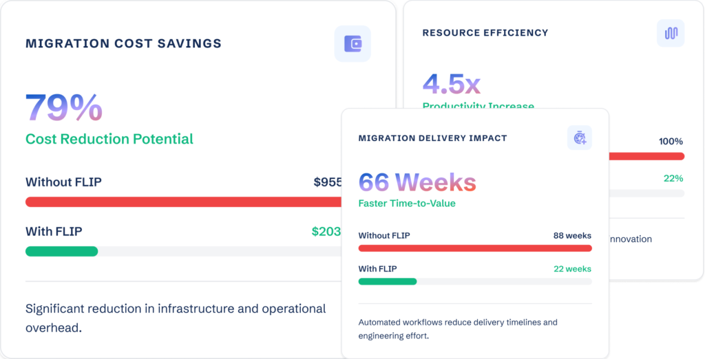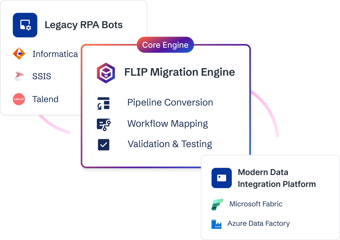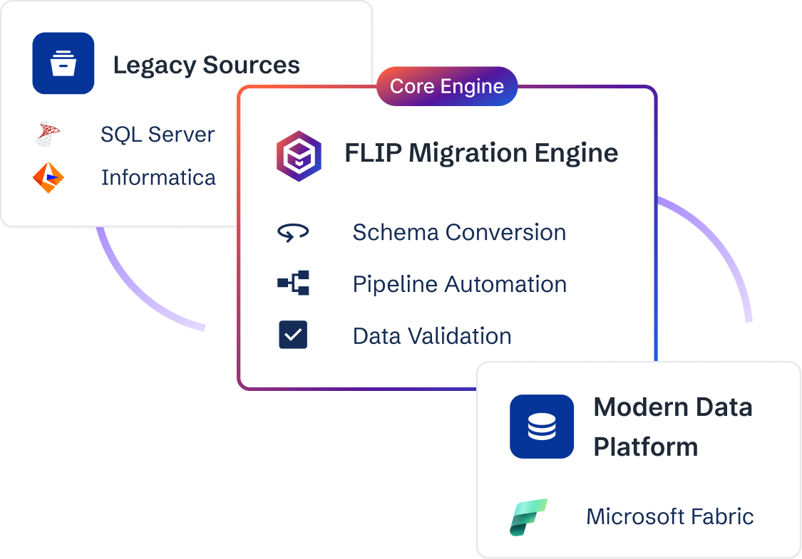 Migrate from legacy, expensive data, BI, and ETL platforms to modern, AI-enabled platforms with FLIP migration acceleartors.