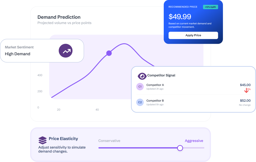 Predicts demand and suggests prices using market and competitor signals. No more guessing, just data, helping improve pricing accuracy and overall margin performance.