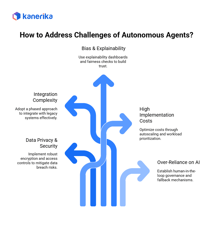 Like other AI systems, autonomous agents can suffer from algorithmic bias if trained on incomplete or skewed datasets. Their “black box” decision-making also raises explainability concerns, especially in regulated sectors such as healthcare and finance. Businesses need explainability dashboards, audit logs, and fairness checks to build trust and comply with governance standards.