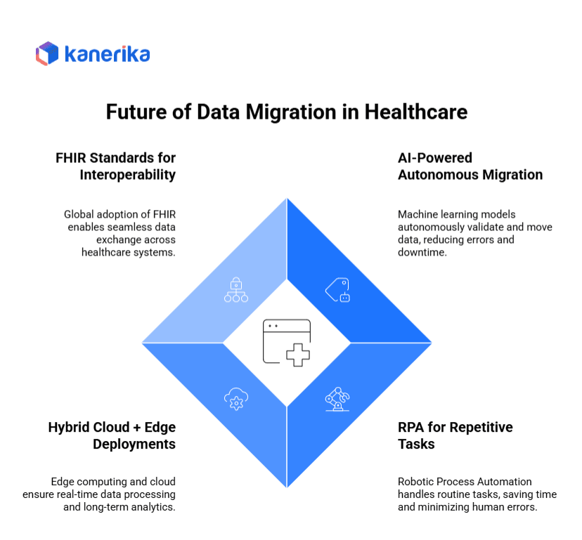 The future of data migration lies in AI-powered autonomous migration, robotic process automation (RPA), hybrid cloud + edge deployments, and adoption of FHIR for interoperability.
