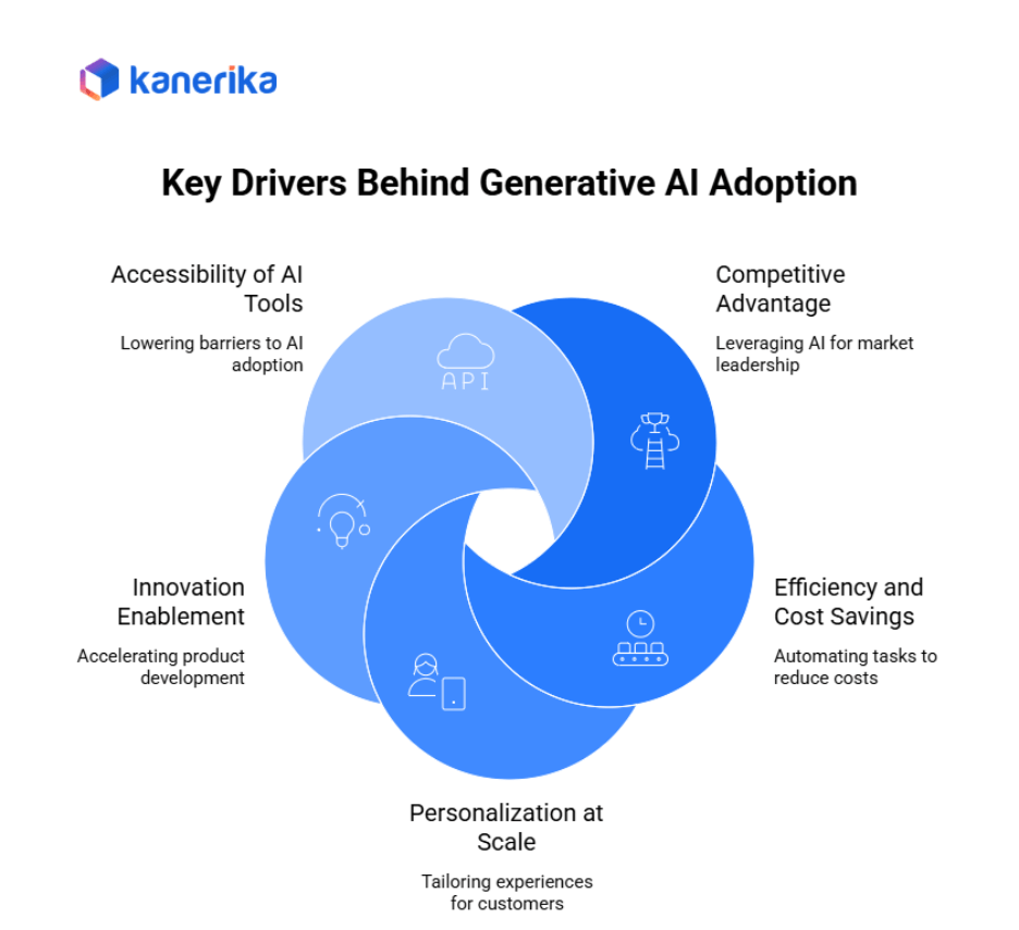 Key Drivers Behind Generative AI Adoption Enterprises worldwide are rapidly embracing Generative AI to accelerate innovation, enhance efficiency , and gain a competitive edge. Several key factors are fueling this adoption and making AI a strategic imperative across industries .
