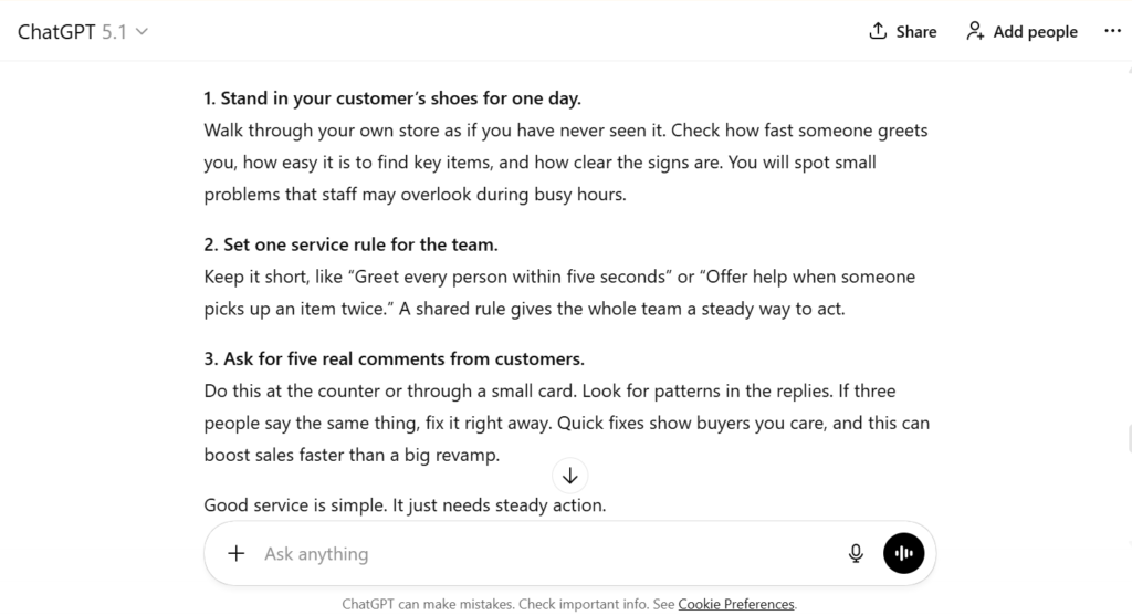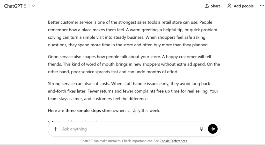 “You are a business coach. Write a 300-word note for retail store owners on how better customer service can grow sales. Add three steps that they can apply this week. Keep it clear and practical.”