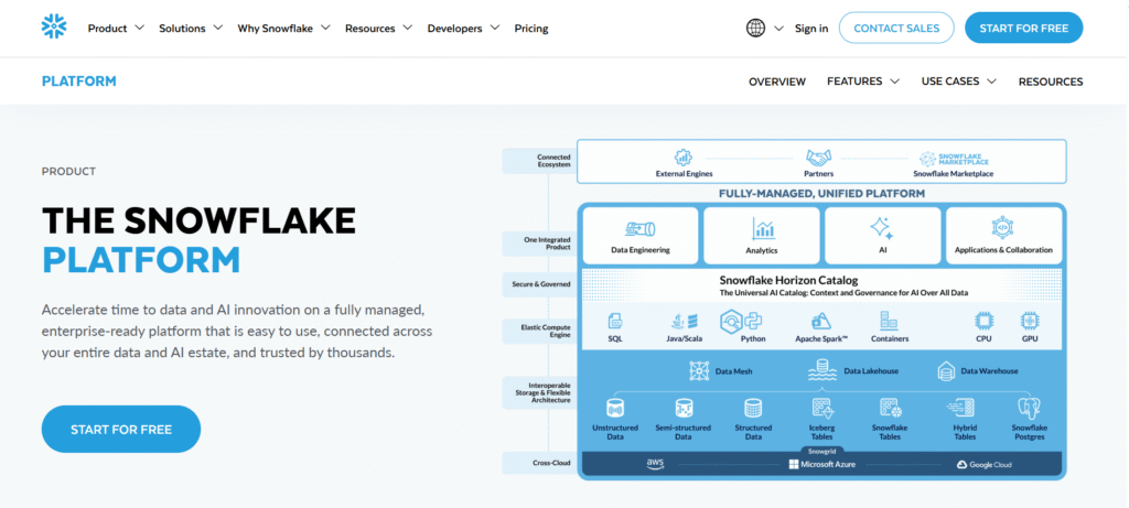3. Snowflake Data Cloud Snowflake offers a cloud-native data environment that separates compute from storage, allowing teams to scale each independently. It supports structured, semi-structured, and unstructured data while enabling secure sharing across teams and partners. Furthermore, Snowflake has become a core component of unified platforms because it provides warehousing, data engineering , collaboration, and analytics within a single, governed framework.