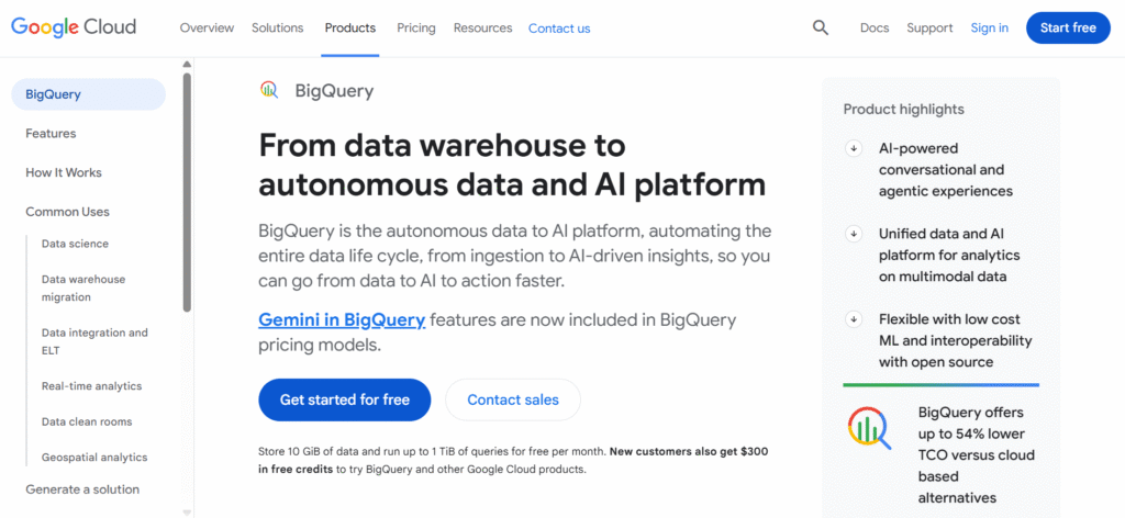 4. Google BigQuery and Data Cloud BigQuery is a serverless enterprise warehouse designed for fast SQL analytics on massive datasets. It removes the need for infrastructure setup, making it easier for organizations to focus on insights rather than upkeep. In addition, Google’s Data Cloud provides independent data to an AI platform built on BigQuery that brings data together into one place, integrating structured and unstructured data with AI to deliver insights quickly. Its integration with Google Cloud and Vertex AI makes it a powerful choice for unified platforms combining analytics and machine learning.