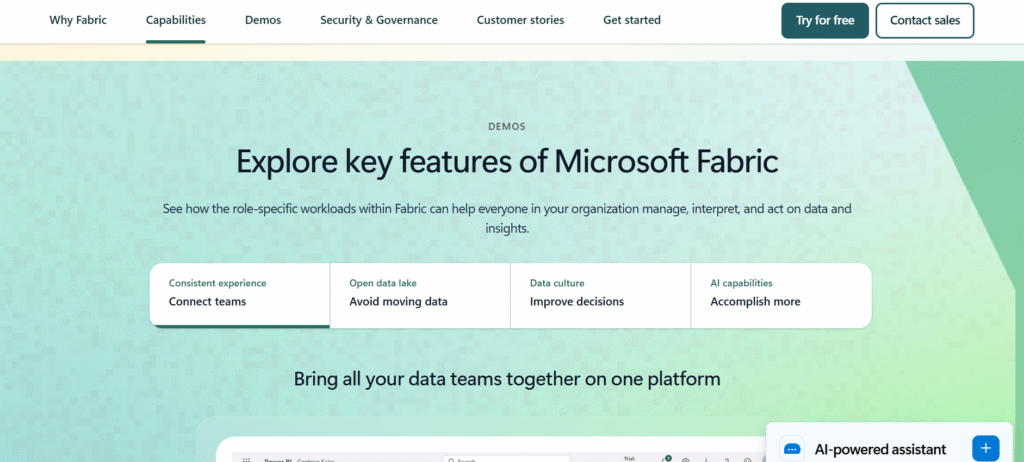 5. Microsoft Fabric Microsoft Fabric unifies data engineering, lakehouse storage, ETL, governance, and business intelligence into a single SaaS platform. By bringing Power BI , Synapse, and Data Factory into a single environment, Fabric removes friction between data preparation and reporting.