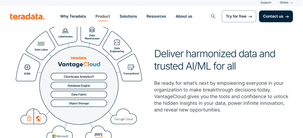 7. Teradata VantageCloud Teradata offers a complete data lake solution through its VantageCloud platform. VantageCloud is a multi-cloud environment that simplifies data management by providing a unified data access layer that lets users query data across different sources without moving or copying data. The platform offers powerful analytics features, including advanced SQL, machine learning , and graph analytics. In particular, organizations in regulated industries value Teradata’s enterprise-grade governance and performance improvement features.