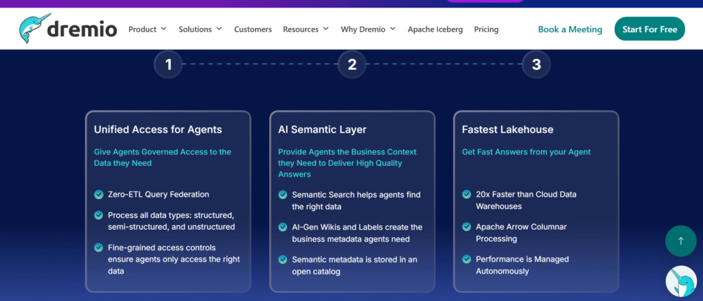8. Dremio Dremio is the unified lakehouse platform for self-service analytics and AI, serving hundreds of global enterprises, including Maersk, Amazon, Regeneron, NetApp, and S&P Global. Built on Apache Iceberg and Apache Arrow, Dremio provides an open lakehouse setup enabling fast time to insight and platform flexibility. In particular, the platform improves query performance through its Arrow-based query engine and removes data silos by enabling cross-data-lake, database, and warehouse queries. As a result, teams can work with data wherever it lives.