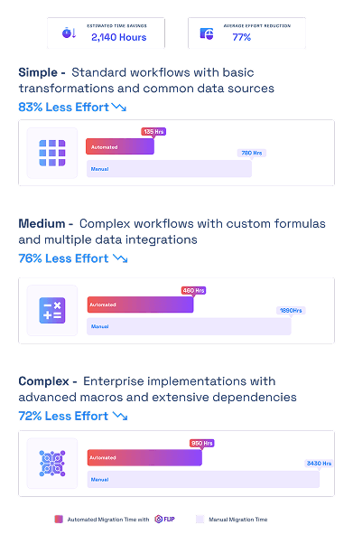 Migration duration depends on workflow complexity and volume. Simple migrations with basic transformations take 80-120 hours with automation versus 600-800 hours manually. Complex enterprise migrations with extensive macros and dependencies take 750-950 hours automated versus 3,000-3,500 hours manually, representing 70-80% time savings.